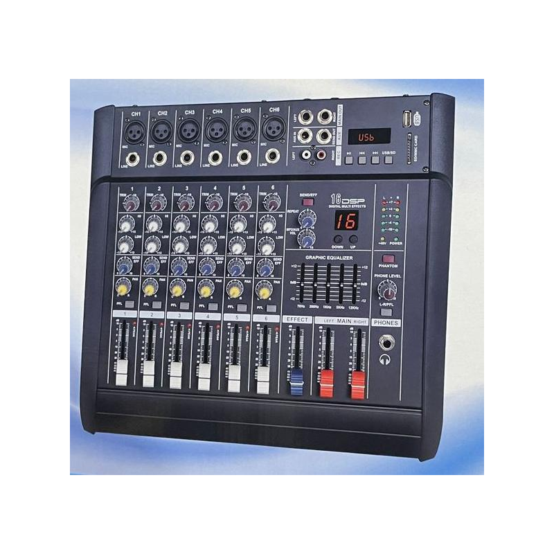 Mélangeur alimenté à 6 canaux avec entrée symétrique + alimentation fantôme 48 V disponible sur chaque prise micro d'entrée