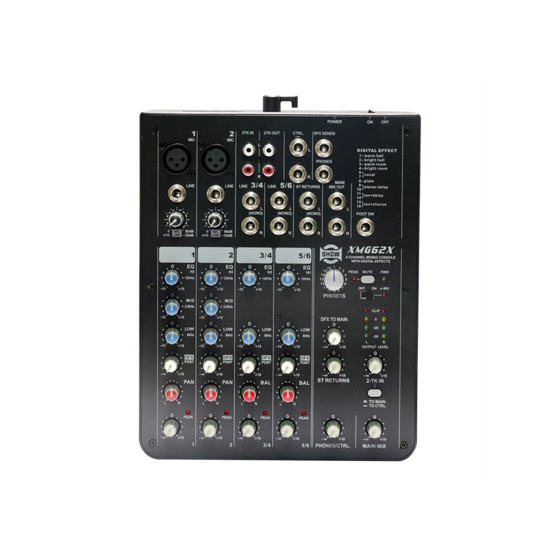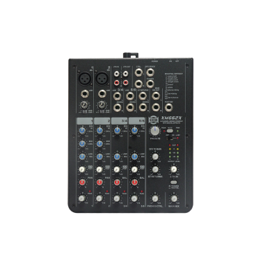 XMG62X est le mélangeur le plus compact de la gamme XMG. Il offre un total de 6 entrées dont 2 voies mono et 2 voies stéréo.