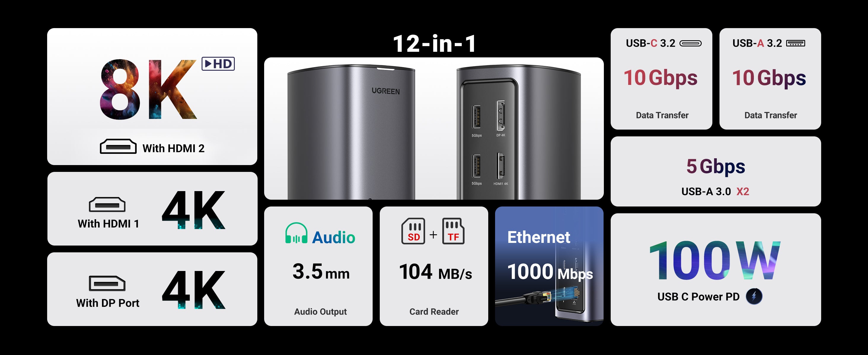 Hub USB-C Ugreen Revodok 12 en 1 Supporte PD (Power Delivery) 100W Recharge (90325)