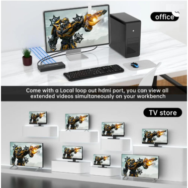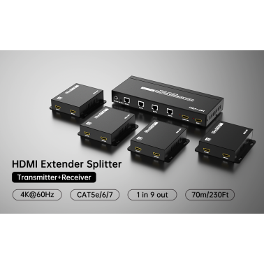 Ce répartiteur d'extension HDMI étend le signal HDMI sans perte à 9 moniteurs simultanément, (4 moniteurs via un câble Cat5/Cat6/Cat7, 4 autres moniteurs via un câble HDMI, le dernier via le port HDMI LOOP OUT,) partageant 9 vidéos identiques.
